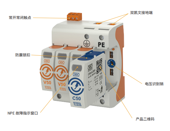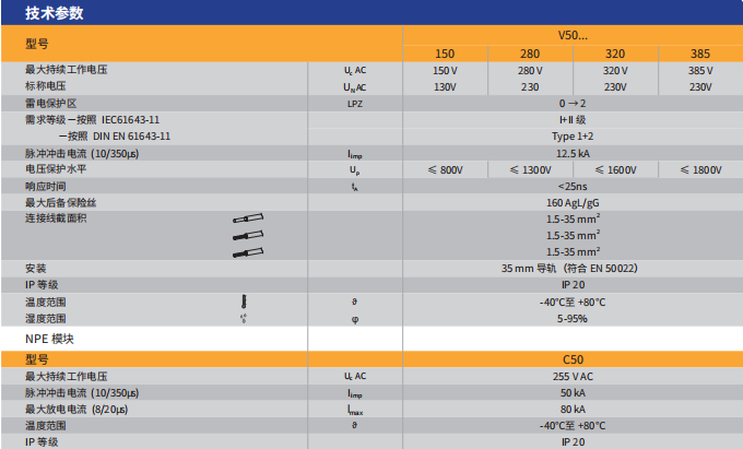 V50... 系列浪涌保护器,符合 VDE 0100-443 (IEC 60364-4-44) 标准。依据 DIN EN 61643-11 及 IEC61643 - 11 等标准要求,由德国 OBO 设计、制造的 I+ II 级 组合型防雷器。可用于 TN-C-S、TN-S、TT 和 IT 系统中,安装简单、可靠。在建筑 物雷电保护安装工程中,它保证了电源线上的等电位连接。当电源线架空引入建筑物 时,架空线可能会引入部分直接雷击雷电流,在此种建筑物电源架空引入的线路上, 该保护器也可应用。 高性能防雷器 OBO V50... 内有一个特别的压敏电阻电路,装置内含良好非线性特 性(α>30)的氧化锌压敏电阻。即使电路出现高能电涌,设备也能得到最大程度的保 护。甚至当冲击电流 12.5kA 时,防雷器的残压仍很低。因此,该保护器能够承受直 击雷的部分雷电流。在过载情况下,保护器内置的热感断路器可以将保护器模块从主 电路中脱离出来,保证供电系统正常工作,与此同时状态显示视窗由灰色变为红色, 可选 FS 遥信报警装置,方便随时监控无人值守基站防雷器工作状态。 特性,能够作为一个 I+ OBO 防雷器 V50... 不仅能承受高通流容量的雷电流,同时具有低的保护电压的 II 级联合保护器使用。
